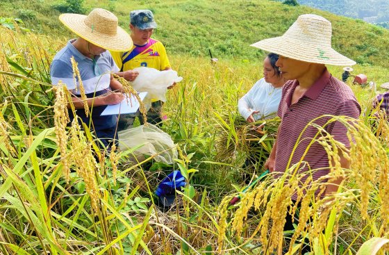 在融水苗族自治县三防镇兴洞村兴洞屯的山坡上,一片金黄的旱禾在阳光下格外耀眼。2025年10月9日,县农业农村局技术人员与农户们正在这里忙碌地开展测产工作。 技术人员正在记录测产相关数据 今年5月初,当地农户吴某某在90多亩干梁林坡地上大胆尝试种植旱禾、小米,探索山地粮食生产新模式。经