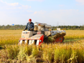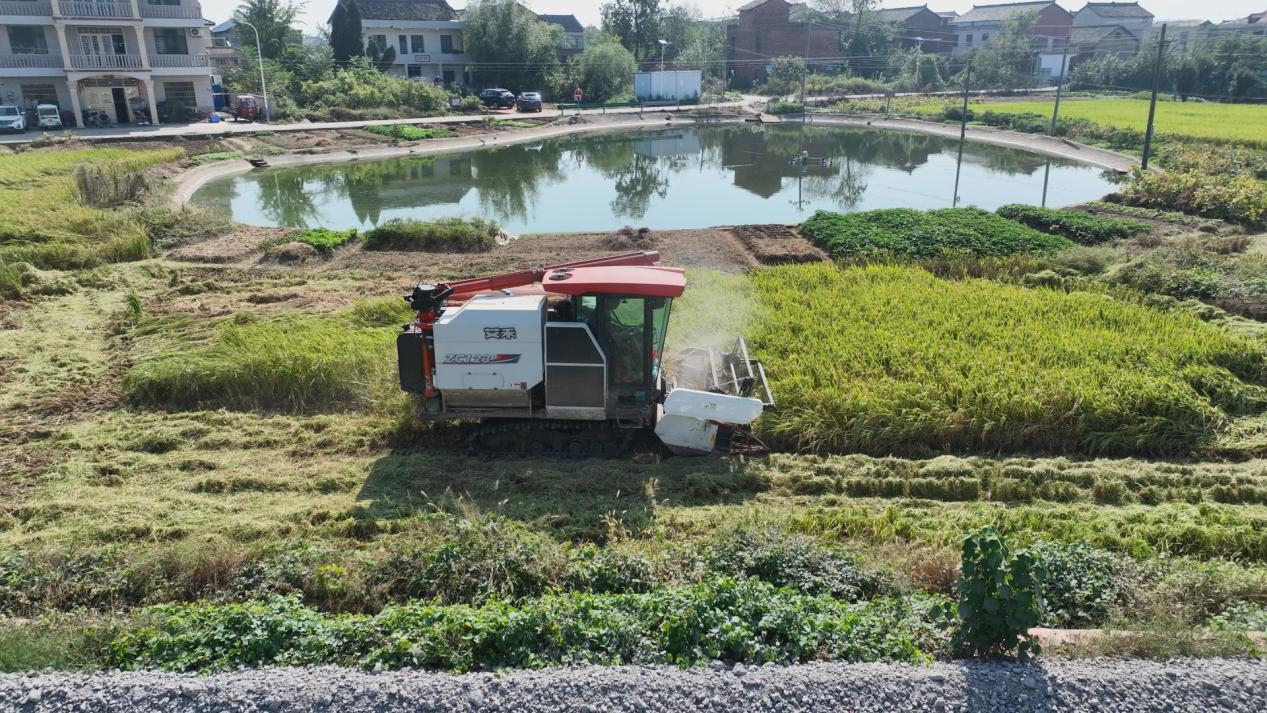 金秋时节,稻谷飘香。湖南省衡阳县48万亩晚稻陆续开镰收割,种植户们抢抓晴好天气纷纷开始晚稻收割作业,田野上呈现一派丰收的喜人图景。 10月10日上午,在衡阳县三湖镇福兴村,成片的稻田遍地金黄,沉甸甸的稻穗压弯了腰。趁着晴好天气,种粮大户唐超正组织农机收割成熟的晚稻,伴随着机械的轰鸣声,颗粒饱满的稻谷