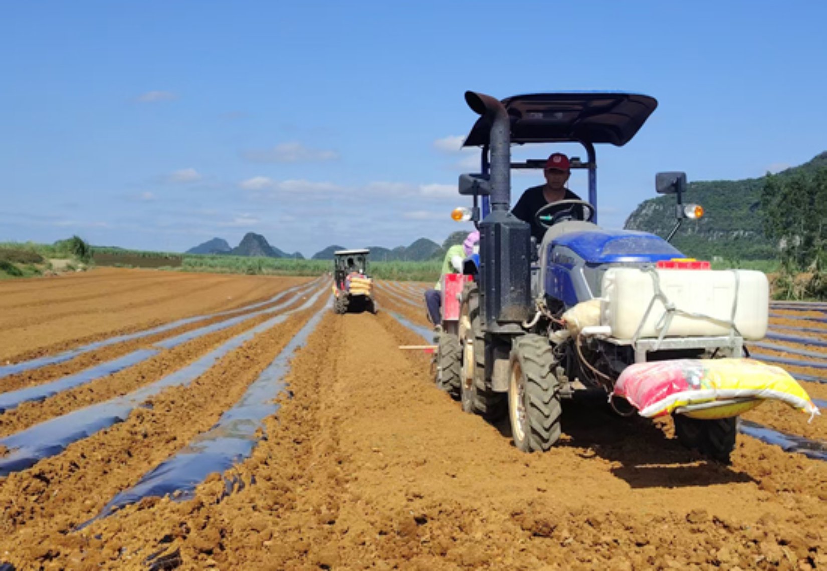田间,播种机如“铁牛”般穿梭,一次性完成精准开沟、均匀施肥、点播薯种、自动回土、铺设地膜全流程。机器过后,铺设地膜的垄线整齐笔直,银白色地膜在阳光下熠熠生辉,大片田地披上了一层整齐的银白色“新衣”。