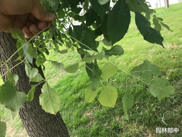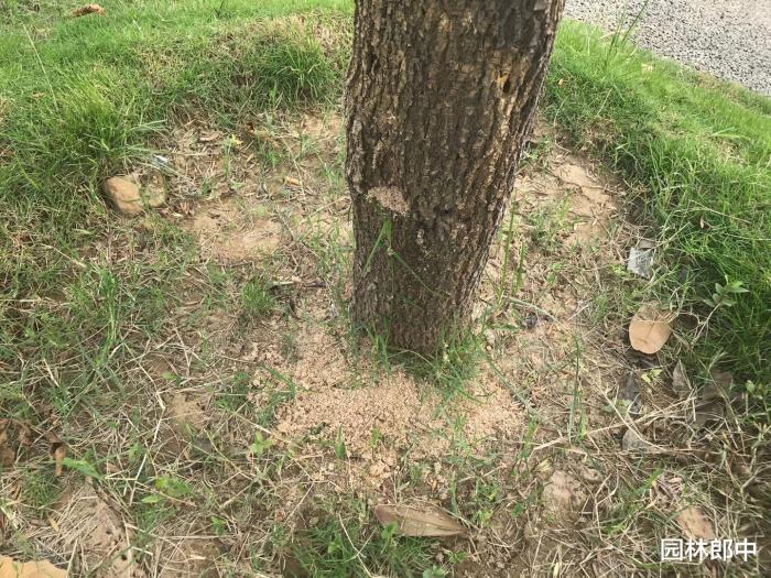 前几日在某公园散步,老远就看到一棵白蜡树长势不是很好,走近一看在树下树穴内发现了许多细细的木屑丝,看这些木屑已经有一段时间了,不像是新鲜的木屑,应该是蛀干害虫前段时间危害所致,这一段时间并没有新鲜的木屑出来。