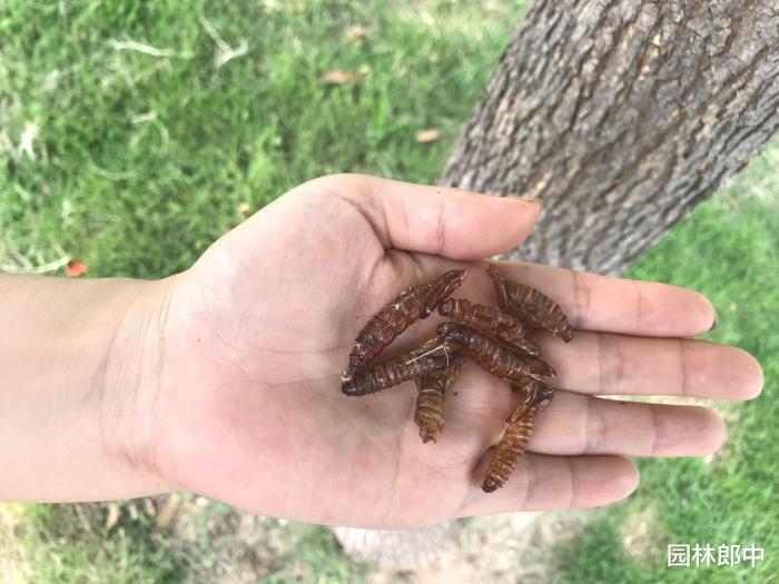 在木屑中仔细观察,发现了许多天牛幼虫羽化为成虫时所蜕下的淡黄色虫皮,在一棵树下陆陆续续找到了八九条幼虫羽化时蜕下的虫皮,数量可以说是相当多了。