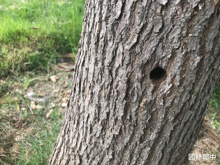 云斑天牛危害苗木后的虫孔比较特殊,其虫孔基本上与成人的拇指粗细差不多;而且这些虫孔十分规则,呈圆形,虫孔内部的孔壁十分光滑,看起来就像是被电钻钻成的,有时在虫孔的边上还可以看到一些碎碎的木屑。