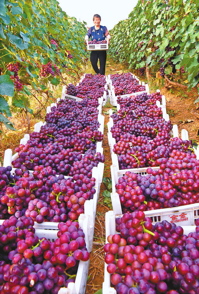 眼下,广袤的祖国大地迎来硕果累累的金秋时节,田间地头、农家院落处处是一派丰收景象。图为山东省淄博市沂源县悦庄镇黄家宅村的农民在收获葡萄。