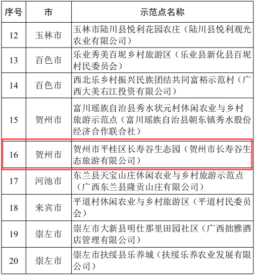 7月24日,自治区农业农村厅、自治区文化和旅游厅发布《2024年全区休闲农业创建项目的通知》,贺州市平桂区长寿谷生态园榜上有名。