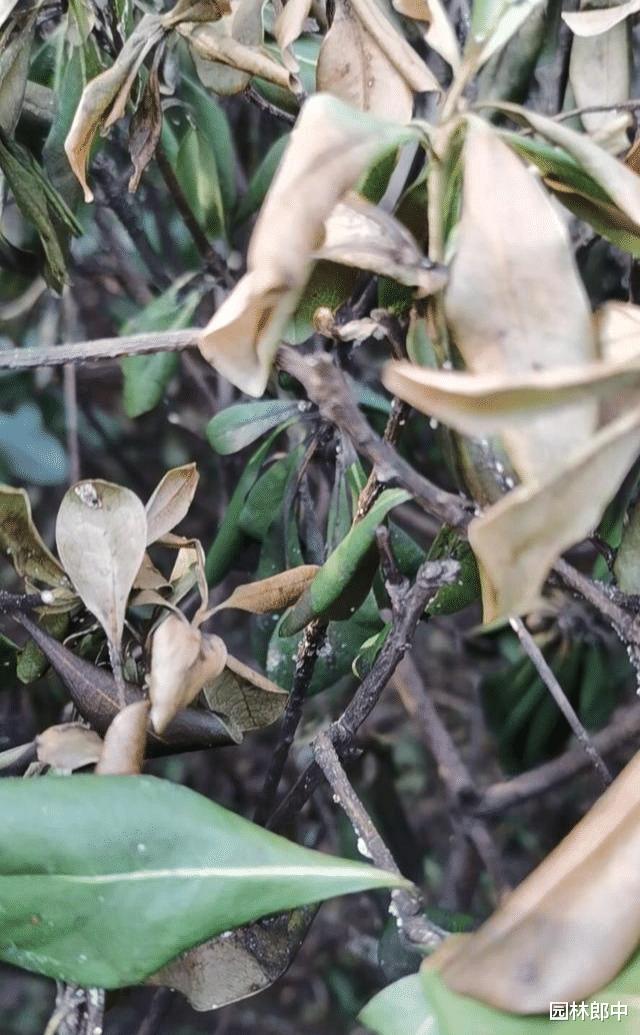 为了进一步弄清楚引起海桐干枯的原因,朋友又给我发过来几张近照: