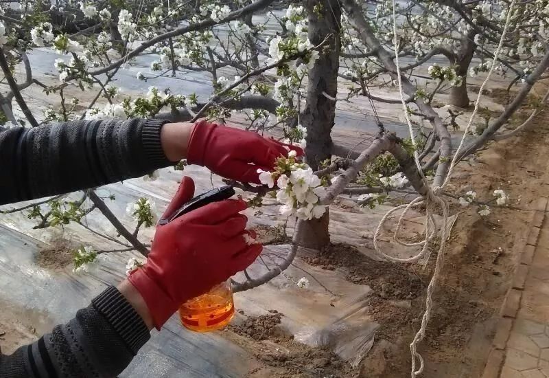 人工授粉:宜在甜樱桃盛花初期开始,连续授粉2~3次。授粉时花粉和水的比例按1∶2稀释,可用毛笔或橡皮头蘸取花粉液,点授到花的柱头上,也可用授粉器授粉。