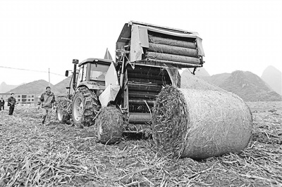广西贵港市覃塘区樟木镇沙村广袤的甘蔗地里,两台机械设备正在奔驰:拢草机欢快驶过,原先还是杂乱无章的满地甘蔗枝叶,顿时被堆成一长垄;随后驶过的打捆机,将甘蔗枝叶吞进“肚子”里,2分钟后尾部一翘,一个1米多高、250公斤重的巨型圆筒从后厢滚了出来……