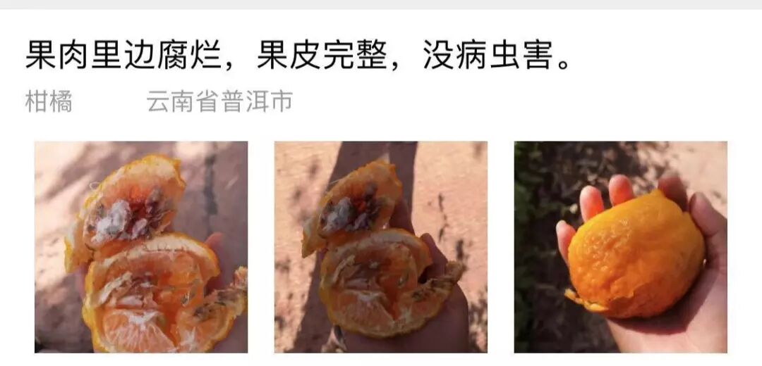 最近有橘农朋友反映,自家的柑橘从外看完好无损,但里面却发霉发烂,不知是何缘由?