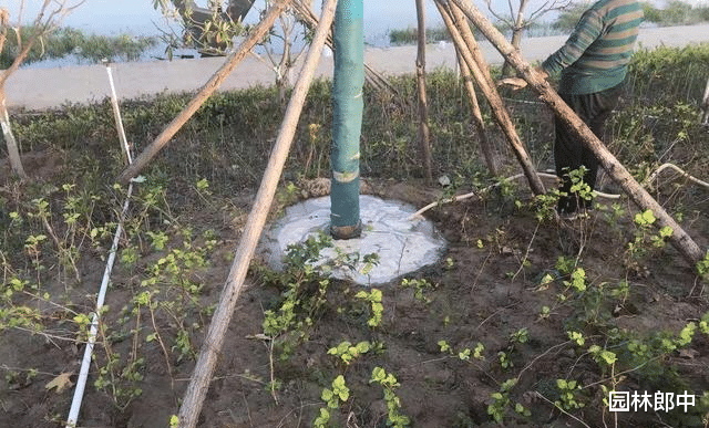 如果是在春、夏、早秋等三个季节的时候进行栽植的树木,大家可以参考我之前的文章《大树栽植后期养护之——浇水是个技术活儿,没有想象的那么简单!》中浇三水的方式,来浇灌树木移栽后的第一次定根水。