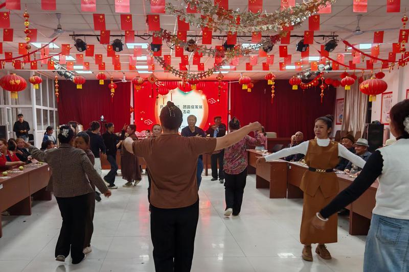 随后,活动进入“吃月饼、享团圆”互动环节。村民们围坐在一起,品尝着香甜的月饼,畅谈家乡变化,展望美好未来。不知不觉中,欢快的麦西来普乐曲响起,大家自发地手挽手跳起舞来,将节日气氛推向高潮。文化大礼堂内歌舞飞扬,欢声笑语不绝于耳,处处洋溢着民族团结的喜庆氛围。