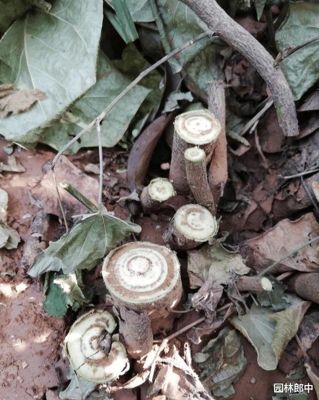 图为干枯紫荆枝干横切面轮纹状的病斑
