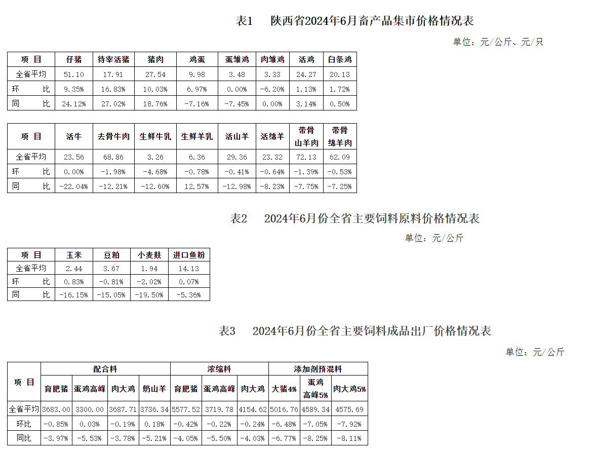 据对全省460个畜禽生产监测村、650个畜禽生产监测场、50个畜产品市场价格监测点和67个市县畜禽生产成本调研、“陕西动物卫生监督管理平台”、“全国畜禽屠宰行业管理平台”、全省工业饲料生产企业有关数据综合分析,与5月份比,全省生猪价格上涨,生猪存出栏增长,能繁母猪存栏下降,生猪产能稳步调整;牛羊肉价格下降,肉牛存栏下降,出栏增长,肉羊存出栏均增长,牛羊生产稳步推进;鸡蛋、活鸡价格上涨,蛋鸡存栏增长,肉鸡存出栏均下降,家禽生产平稳运行;生鲜牛羊乳价格下降,奶牛、奶山羊存栏下降,奶业生产持续提升;玉米价格上涨,豆粕、添加剂预混料价格下降,饲料总产量增长;生猪、肉羊、蛋鸡和奶山羊散养户养殖盈利,奶牛、肉牛、肉鸡和奶山羊规模场养殖亏损,全省畜牧业生产运行平稳。