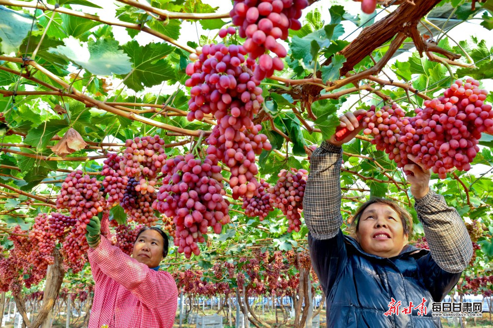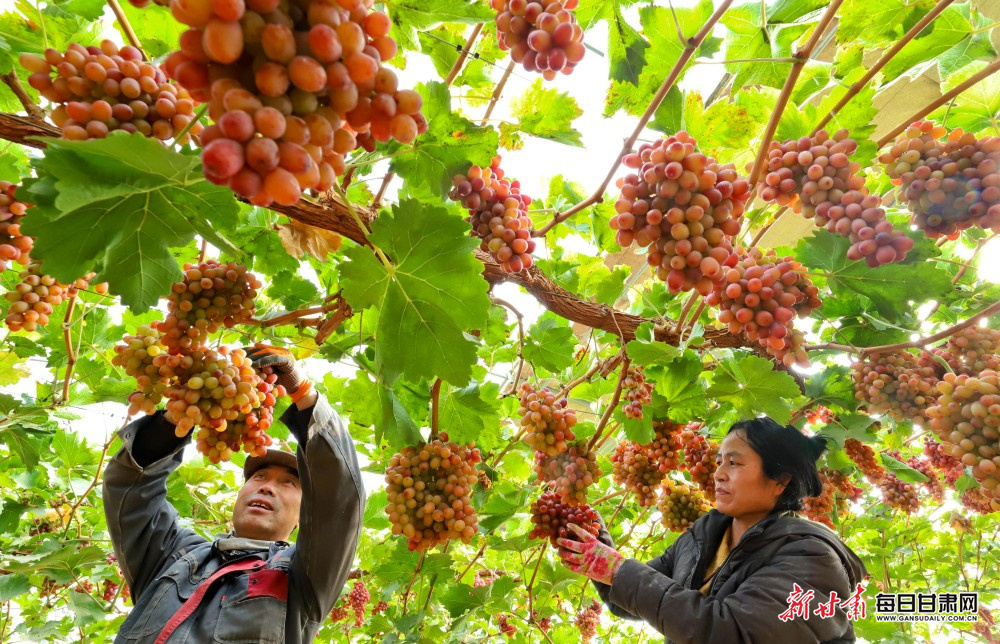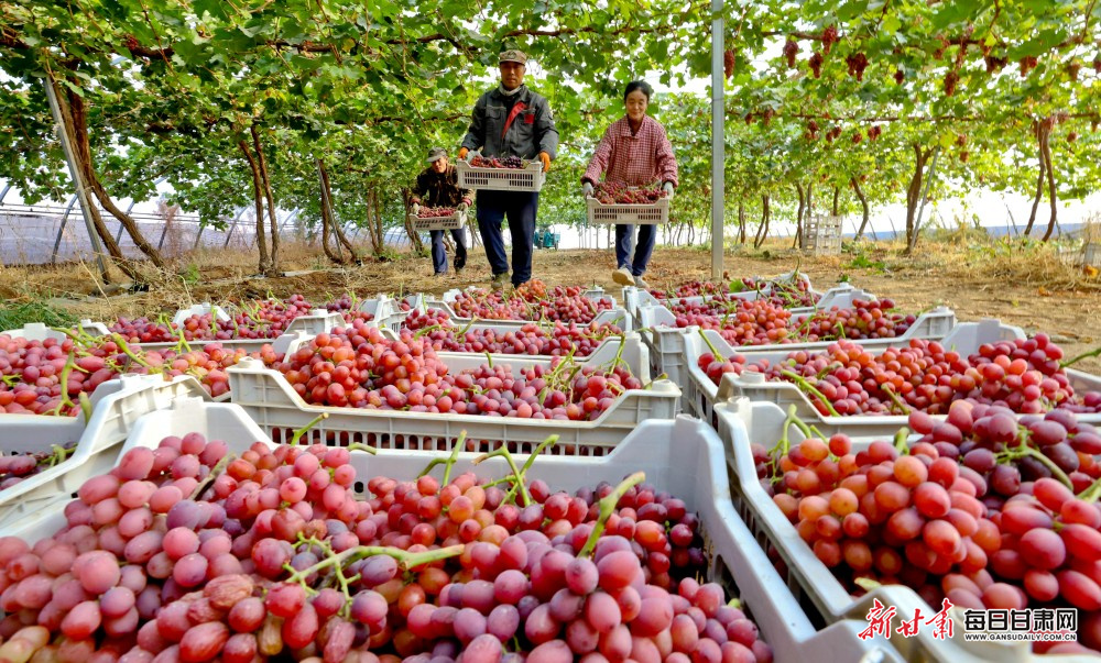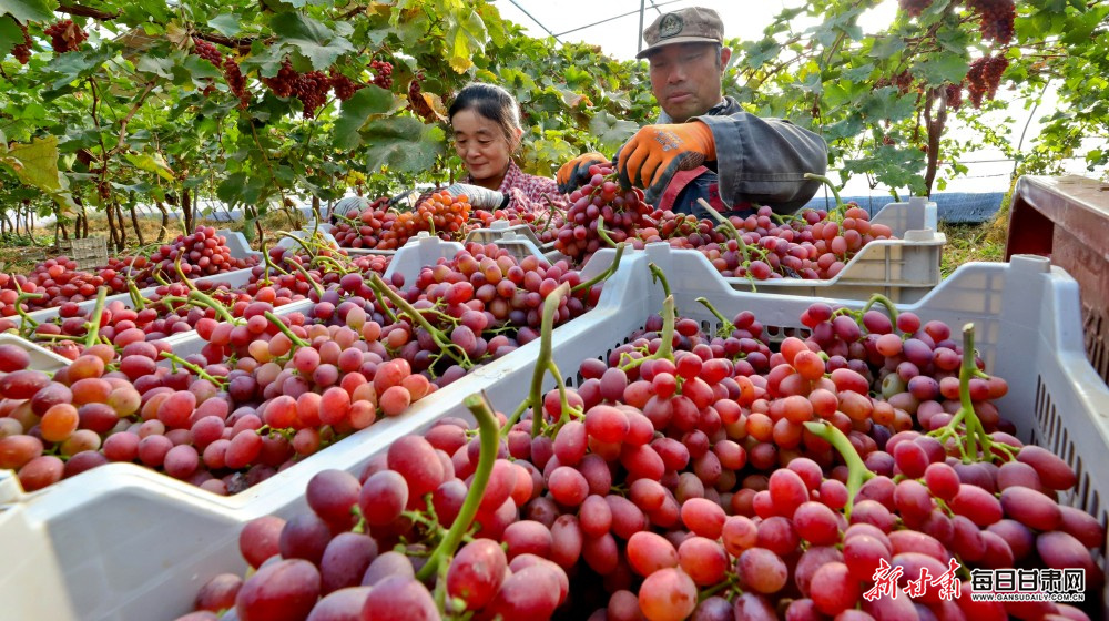 10月20日,位于张掖市临泽县扎尔墩滩现代旱寒农业产业园内的诚坤农业晚熟葡萄种植大棚内,一串串晶莹剔透的晚熟“克瑞森”葡萄缀满枝头,工人们正在紧张忙碌地为北京、宁夏银川、河南郑州的客商采摘鲜食葡萄。