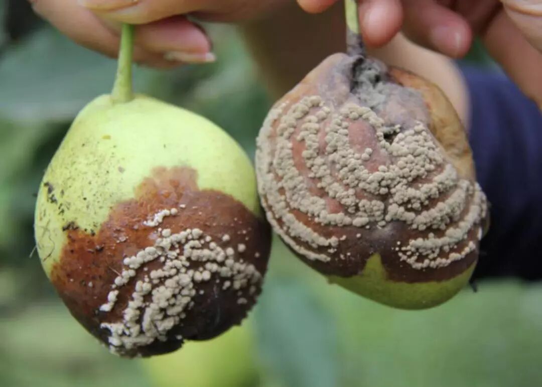 只危害梨树果实,一般近成熟期发病,初为暗褐色病斑,逐步扩大,病情发展迅速,几天全果腐烂,病斑上还着生黄褐色绒毛。