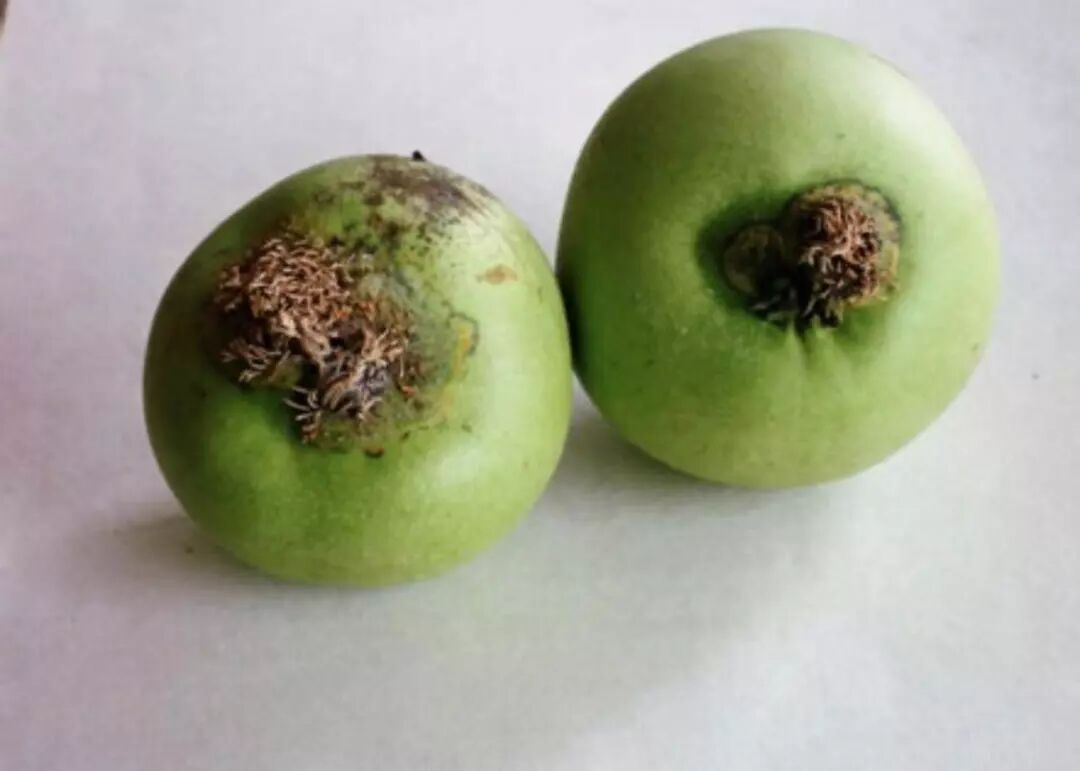 幼果发病为畸形果,会形成不规则的淡黄色至褐色病斑,且病斑上会长出黑色的霉层;成长期果实发病不畸形,但病斑部会凹陷并产生星状龟裂。