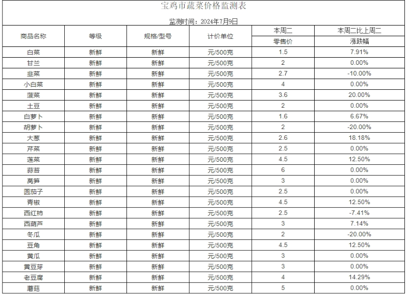 宝鸡市蔬菜价格监测表