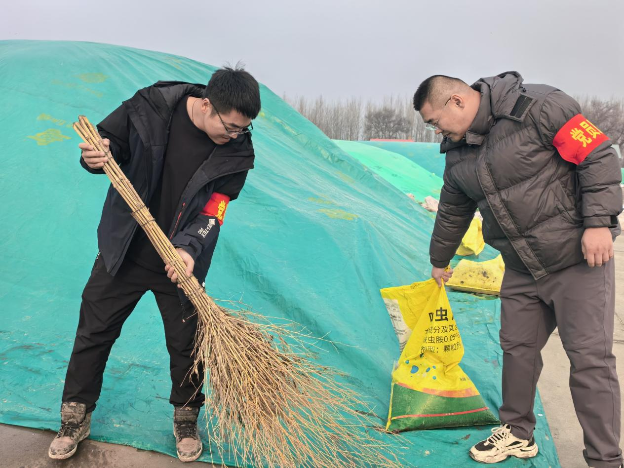 活动中,第八管理区党员干部手持扫帚,认真清理苫布表面积水与杂物,仔细检查粮堆苫盖的密封性,协助种植户规整农资袋、加固存储设施,并对露天堆放粮食的苫布逐一排查,确保无渗漏、无积水,从细节处守护粮食安全。“粮食存储最怕受潮,雨后及时清理和检查,能有效防止发霉变质。”党员陈浩介绍道。此次行动重点围绕存储区的苫布覆盖、排水设施等关键环节展开,累计清理苫布积水面积2000余平方米,规整农资80余袋,排除潜在受潮隐患5处,切实保障了粮食存储安全。