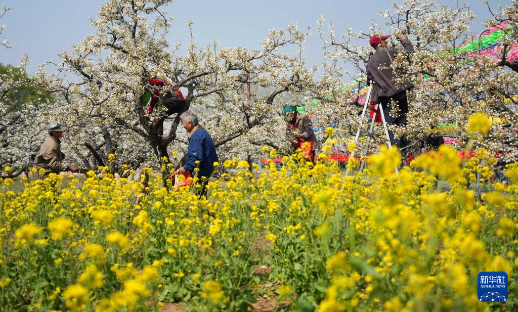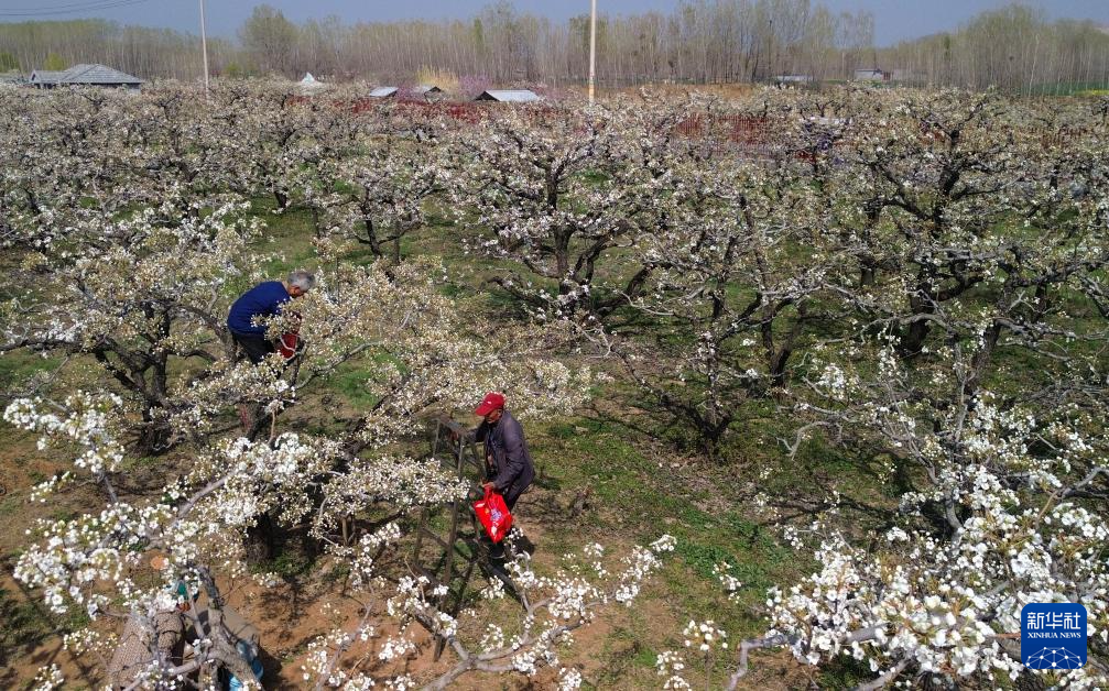 4月1日,在山东省滕州市柴胡店镇,果农在梨园开展人工授粉工作。新华社记者 徐速绘 摄