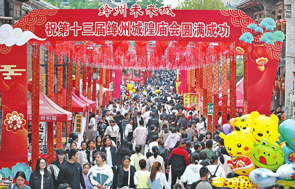 10月2日,游客走进新绛县贡院巷,逛庙会、赏非遗、看古戏。高新生摄