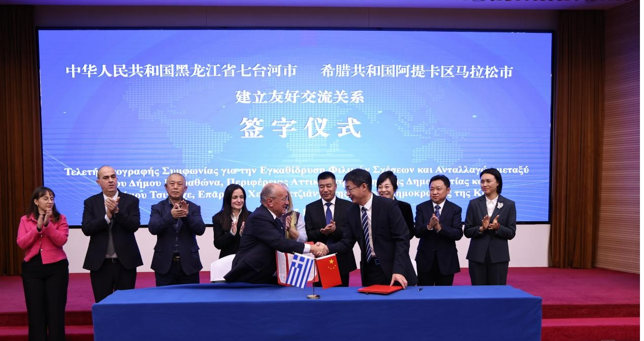 11月20日,由希腊共和国阿提卡区马拉松市市长斯特吉奥斯·齐尔卡斯带队的马拉松市代表团到访黑龙江省七台河市,双方共同签署了两市建立友好交流关系协议书。此次合作被誉为“奥运冠军之城”与“马拉松运动发源地”的一次历史性握手,为深化中希两国地方间人文交流和务实合作注入了新动力。