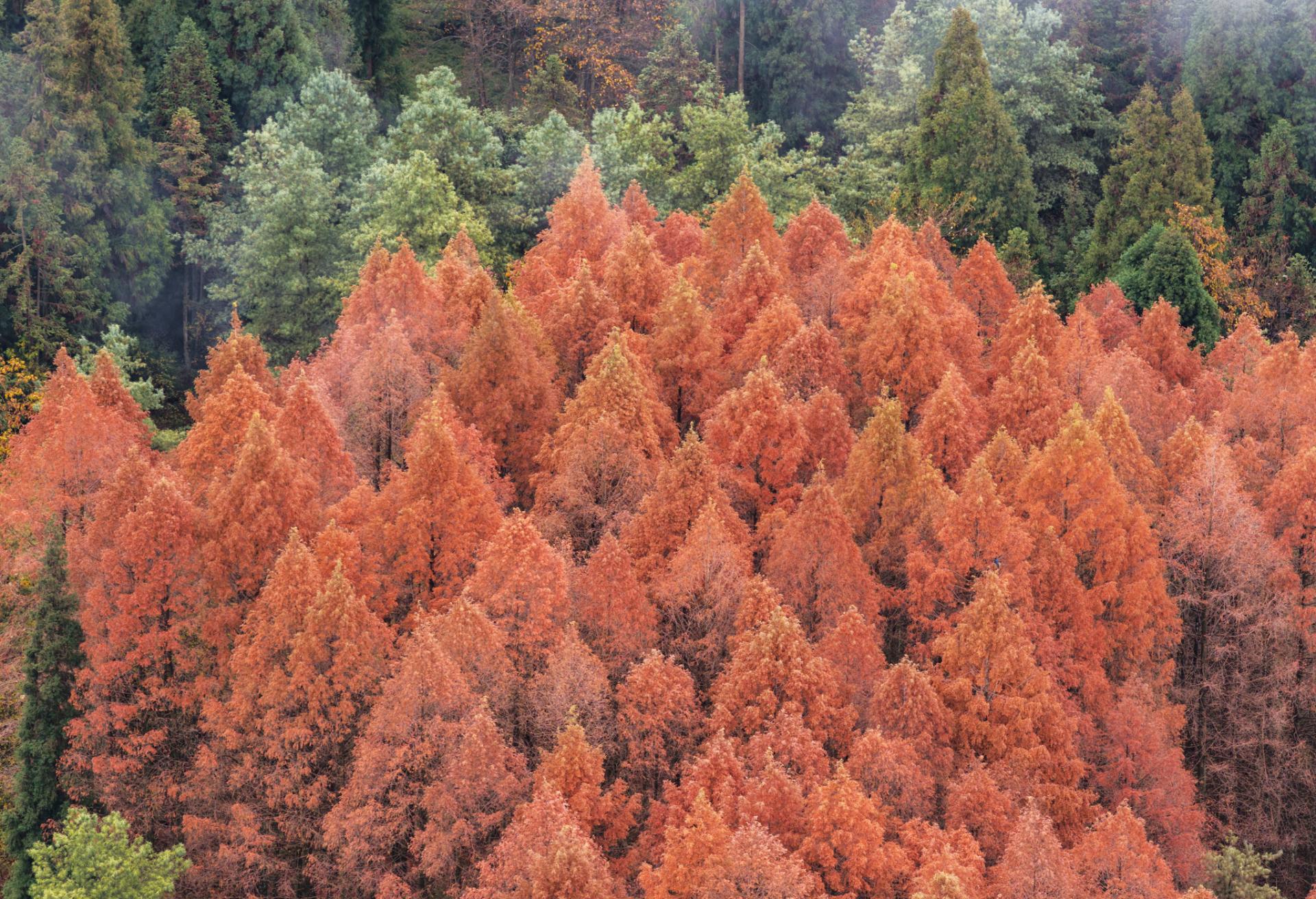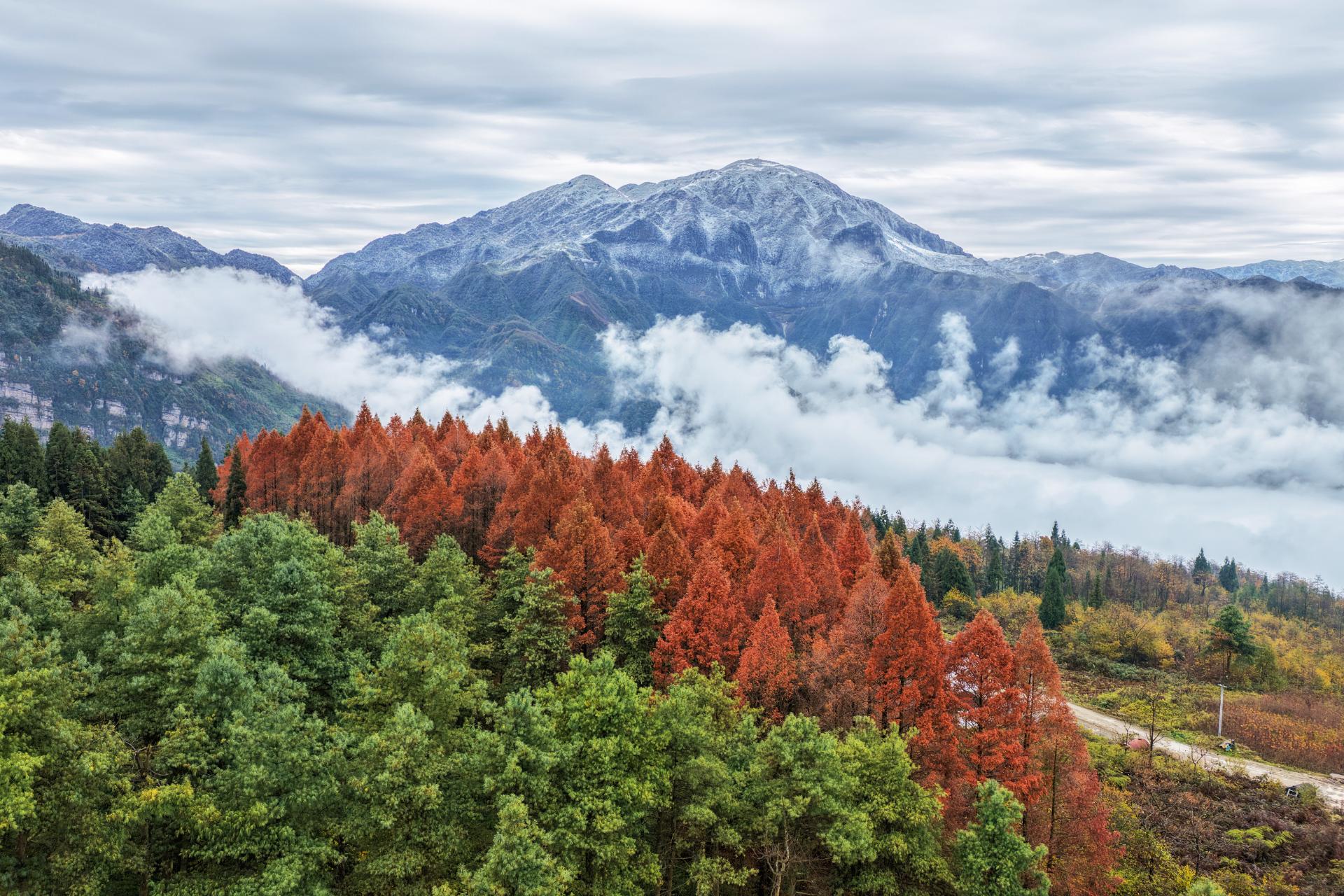 初冬时节,大关县翠屏山宛如一幅绚丽画卷。水杉如火,远山戴雪,晨雾如纱轻绕,松柏苍翠,与红杉交织出梦幻色彩。(通讯员 唐应平 何桂花)