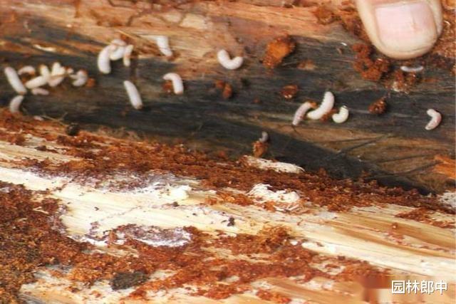 图为树皮下的小蠹虫幼虫