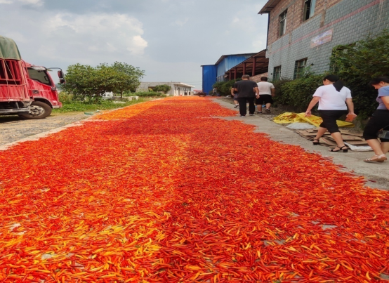 走进耒阳市公平圩镇横冲村,村子里不远处层层叠叠的土地上红绿交错的小米椒点缀其中,当地十几个村民正忙着采摘辣椒,丰收与喜悦的画面美不胜收。顺着辣椒基地走进湖南军浩绿色食品股份有限公司辣椒加工厂,工人们正在忙碌着,有的在洗辣椒、有的在晒辣椒,现场还有一辆卡车正等着装货运往市场,工厂里大道上全是晒满了红色的小米椒,俨然一条用辣椒铺就的致富大道。