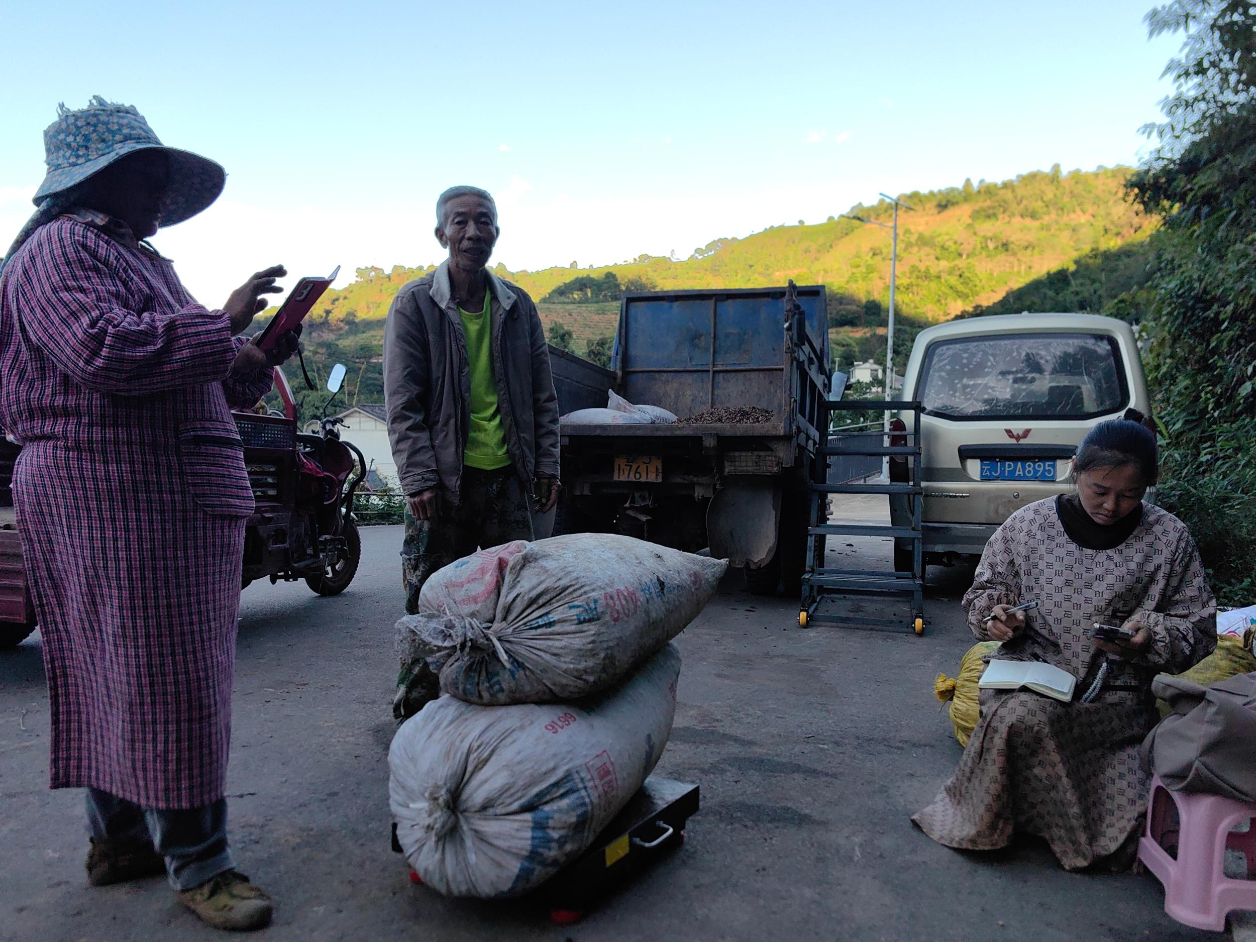 “103公斤,927元;142公斤,1278元……今天最多一家交了372公斤,3348元。都是付的现款。”在罗忠平的账本上,记录了当天收购的咖啡鲜果明细,在咖啡采收季,他每天都要守到晚上八九点,确保咖农当天采摘的鲜果尽数收购运往鲜果处理厂加工。他说,随着咖啡鲜果价格逐年上涨,他已经连续三年来到咖啡种植区域设点收购,今年,像他一样直达种植基地抢收咖啡鲜果的收购商比往年更多。