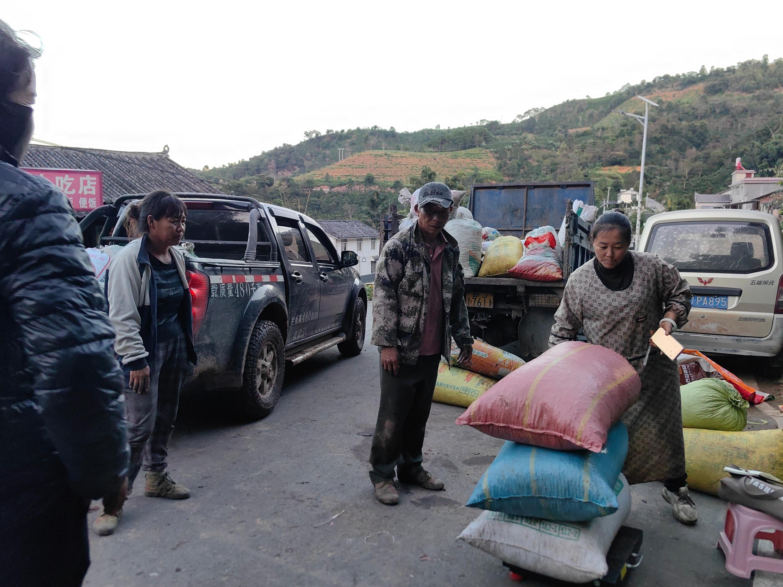 傍晚时分,记者沿着咖啡种植区的生产道路行进,沿途能见到多个咖啡鲜果的临时收购点,有的收购商甚至还提供直达咖啡地的“上门服务”。在收购商罗忠平的收购点,咖农骑着摩托车,载着一袋袋装得满满当当的咖啡鲜果,在路边停了下来,这些都是他们一天采摘的咖啡果实,在收购点称重后,直接微信扫码收款拿到现钱。