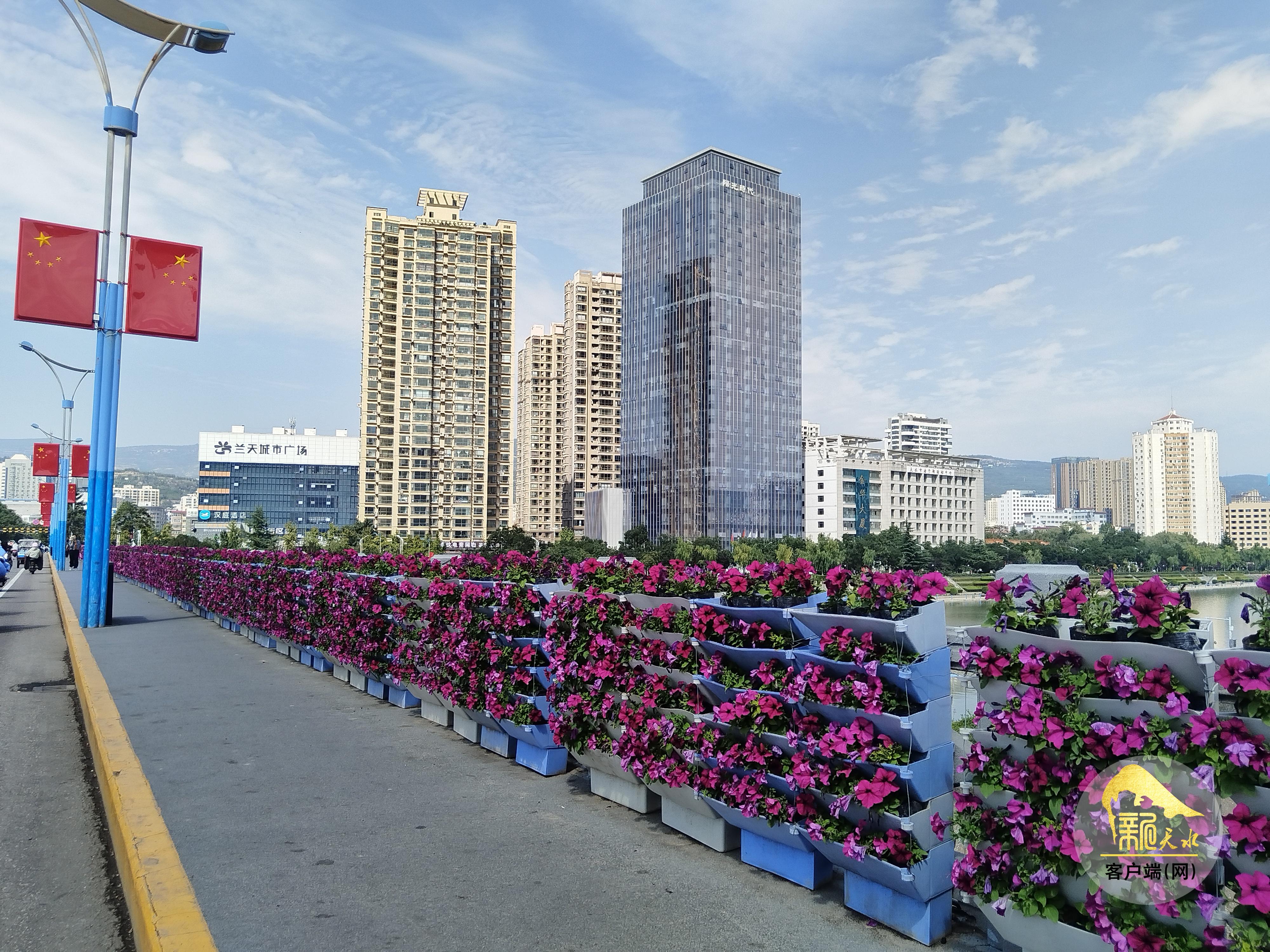 金秋送爽花满城,龙城盛装迎佳节。“双节”将至,秦州区以龙城广场为中心向四周主要道路、重要节点辐射,通过各类型花架、花箱与色彩丰富的花带组合搭配,在伏羲公祭大典期间城市美化的基础上,补添鲜花30万盆,营造景观亮点,提升城市魅力,烘托节日氛围。记者在南大桥、藉滨桥看到,摆放在两侧护栏花箱里的一朵朵牵牛、海棠、小菊迎风摇曳,构成了美丽的花带赏心悦目。