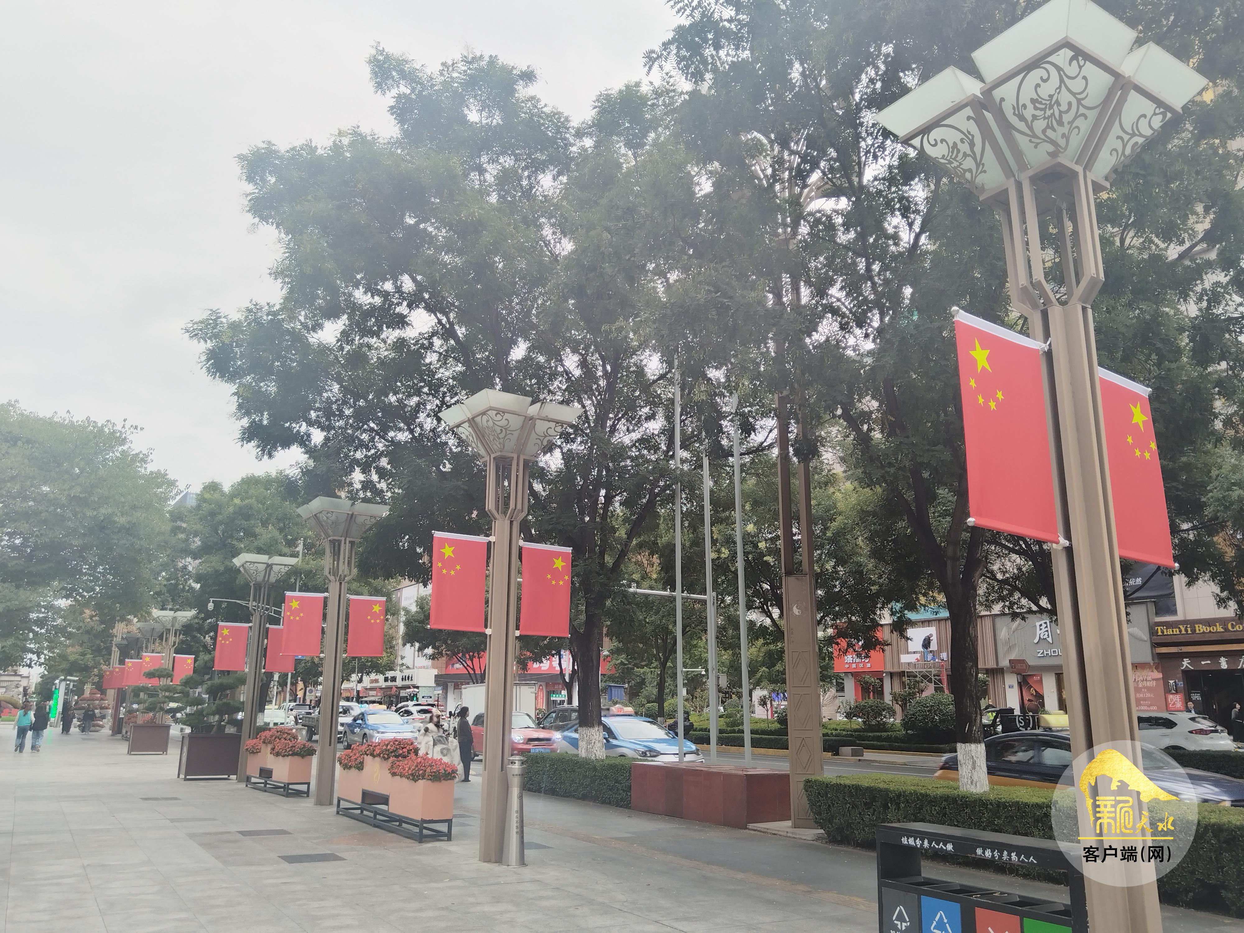 “双节”前夕,记者在秦州区大众路、民主路、建设路、藉河北路、中华东西路步行街以及龙城广场等地看到,道路两侧的路灯杆及沿街单位、小区、商户门前都悬挂起了鲜艳的五星红旗、安装上了国旗灯箱,为城市营造了浓浓的节日氛围。一面面国旗迎风飘扬,不仅装点了节日氛围,更是家国情怀的寄托,凝聚起了人们爱国爱家、共建美好家园的深厚情感与奋进力量。