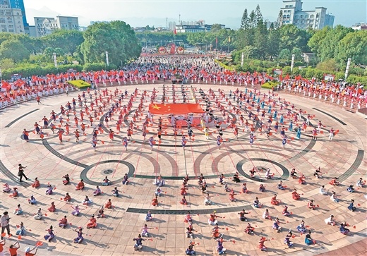 10月1日,贺州市举行“庆国庆 迎中秋”大型广场舞活动,众多舞蹈爱好者欢歌热舞表达对祖国的深情祝福。(黎豪图 摄)