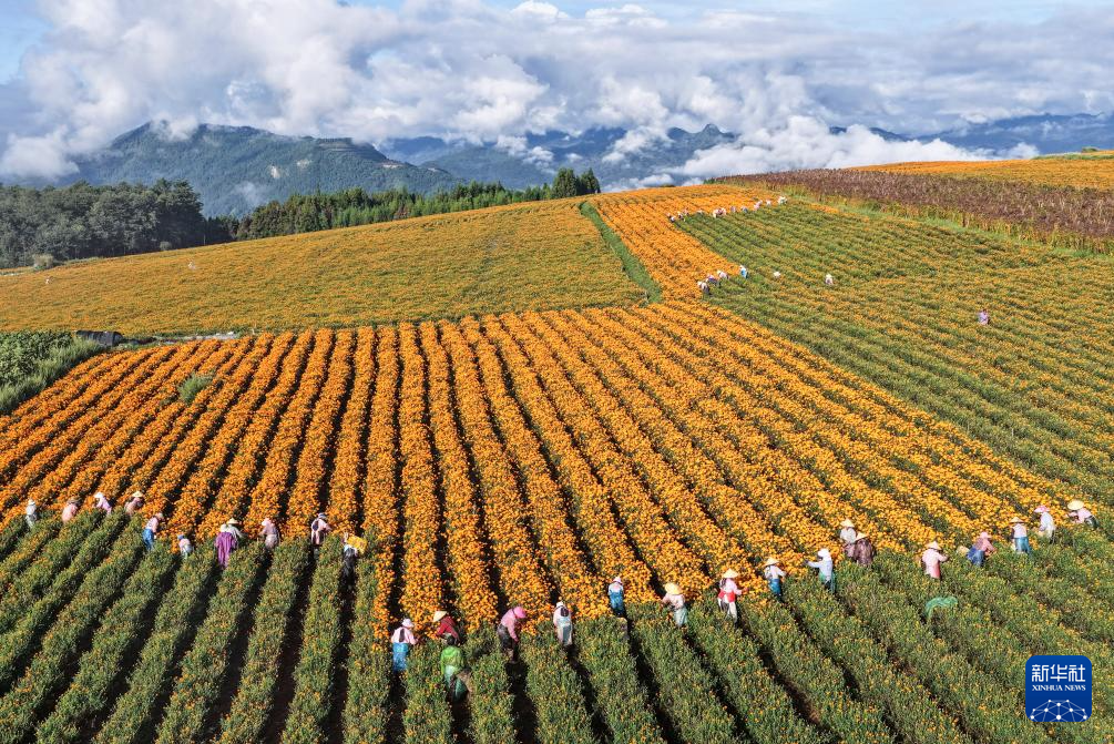 9月5日,农民在云南腾冲市明光镇凤凰村凤凰山采收万寿菊(无人机照片)。