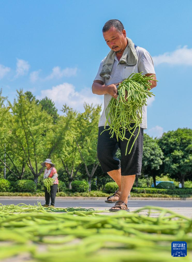 9月5日,在湖南省永州市道县营江街道,农民在晾晒豆角。