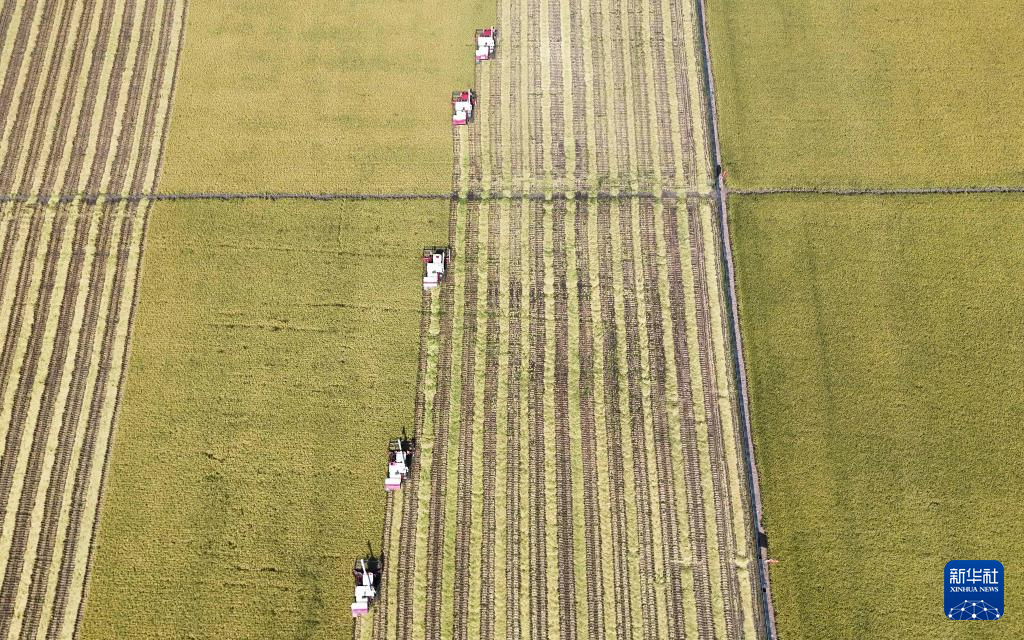 9月5日,在北大荒集团黑龙江江川农场有限公司水稻种植基地,农机手操作农机收割水稻(无人机照片)。