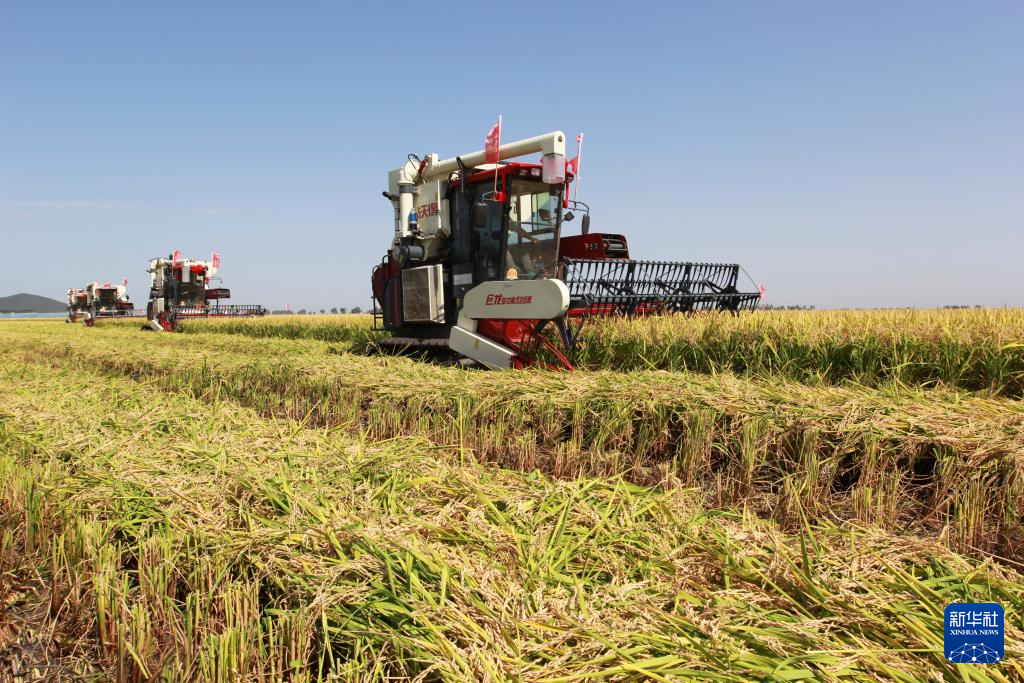9月5日,在北大荒集团黑龙江江川农场有限公司水稻种植基地,农机手操作农机收割水稻。