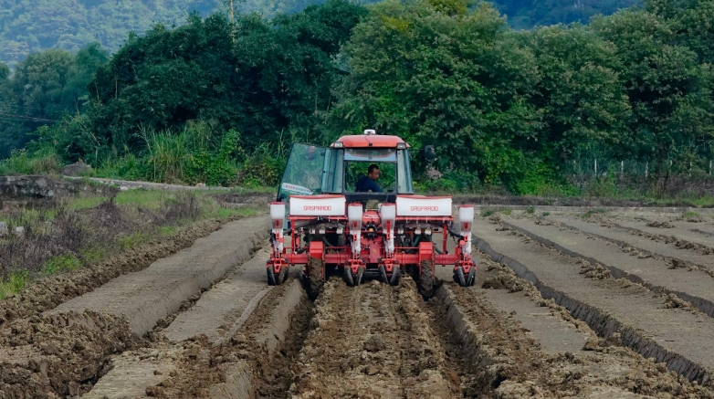在同安镇鲜食玉米示范区内,伴随着机器的轰鸣声,肥沃的土壤被翻起,起垄、播种、施肥等工序也随之完成,一粒粒饱满的种子被精准地播种在土壤中。负责人刘大哥说:“我们全程使用播种机种植,可以实现玉米精准播种并控制肥料的用量,目前每台机械每天可以完成30亩的播种工作,大大提高了工作效率。”