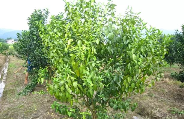 这张是2017年贡柑春梢前树体黄化的资料图,据了解黄化的主因是该果园上年挂果多且未施冬肥,而春梢抽发前需肥量上升,特别是氮肥的需求量大,而表现出老叶缺氮、落叶严重。