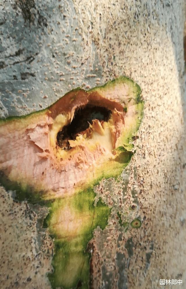 为了弄清楚到底是哪种蛀干害虫在危害这泰国国树腊肠树,首先我让朋友用半斤毒死蜱+半斤有机硅兑水15公斤,对树干整体喷施了一下,利用药物的气味以及强大的渗透能力将这些躲藏在树干内部的害虫给熏出来。