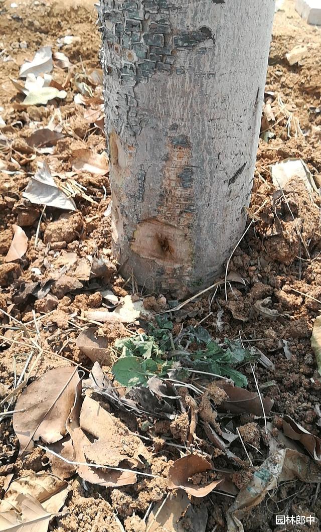 图为树干基部木蠹蛾的危害痕迹