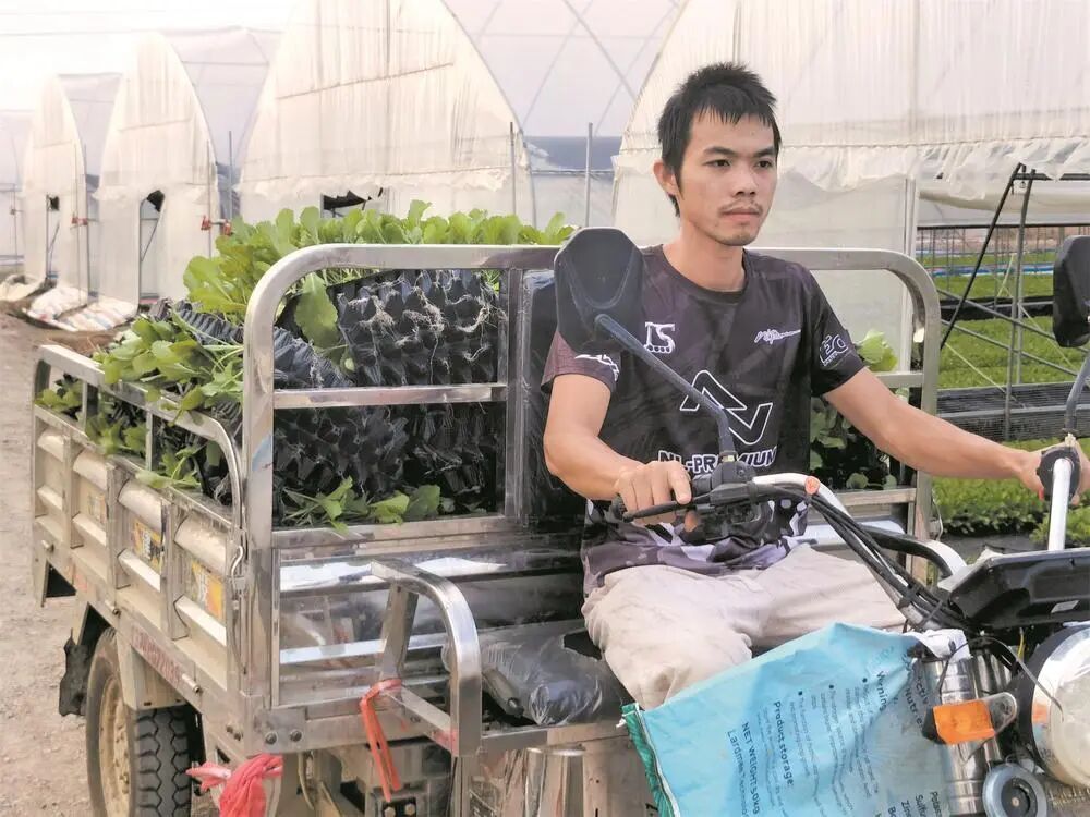 工人运送菜苗。