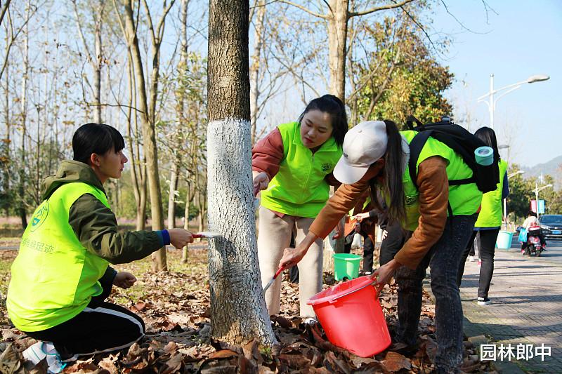 (2) 对树干进行涂白,利用白色可以反射阳光的特性,降低苗木主干上的昼夜温差,从而来达到保护苗木主干不受冻害的目的。