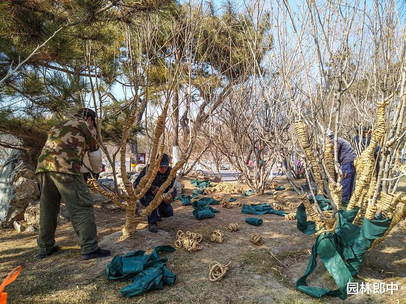 (1) 对于苗木尤其是新移栽的苗木,要将一级分枝的那些大型分叉进行缠绕保护,避免积雪以及低温等对枝杈的伤害。