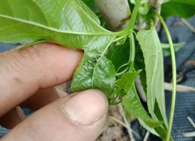 主要有红蜘蛛、二斑叶螨等,前者可危害叶片、枝蔓、果实,通过吸干或破坏植株细胞而造成失绿,使叶片发黄发白,影响果实上色;后者除行刺吸危害外,还能释放能刺激植物生长的物质,导致百香果发育畸形,似葫芦果。