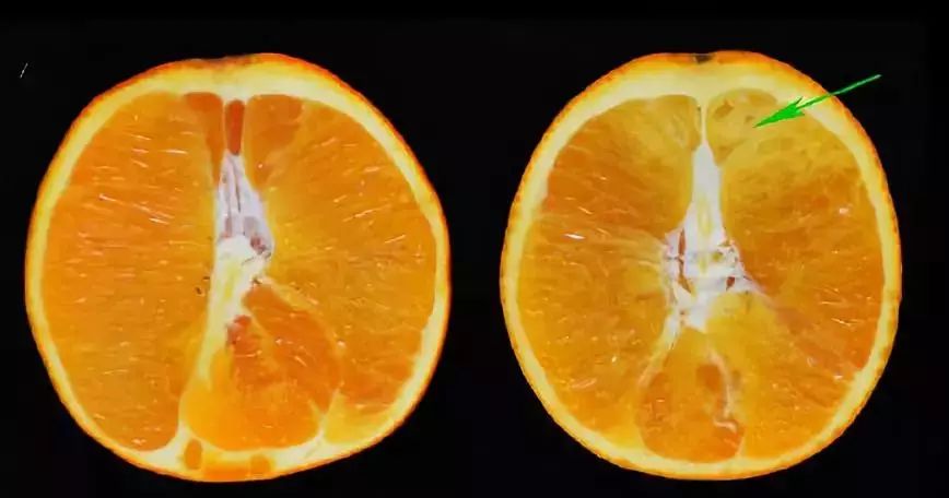 脐橙正常果(左)与枯水果(右)切面对比 图片来源:曹琦