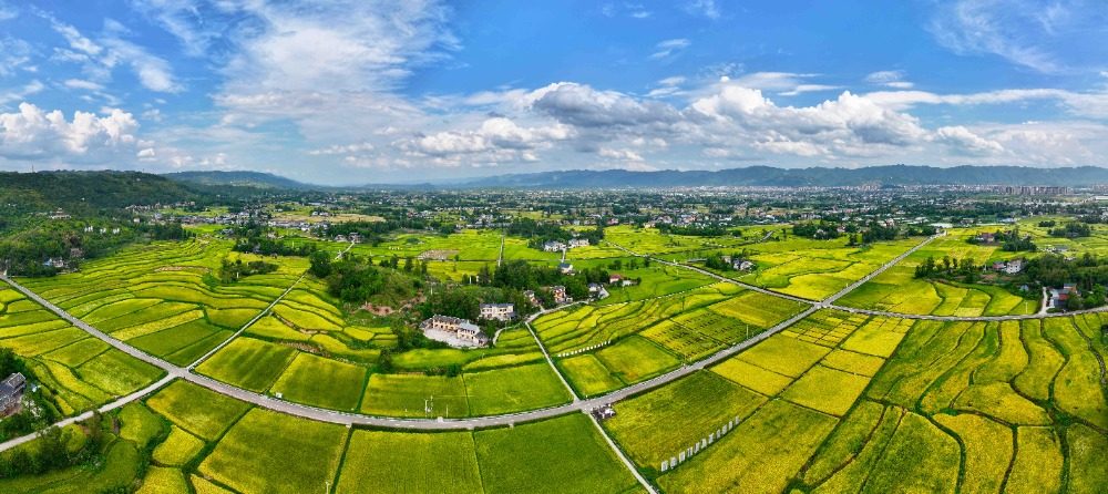 ▲2025年8月24日,梁平区安胜镇龙印村,稻田逐渐泛黄,与村庄、远山、蓝天白云构成一幅“丰”景如画的秋日乡村画卷(无人机照片)。特约摄影 刘辉