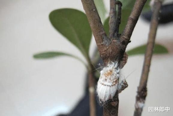 图为海桐枝干上的吹绵蚧