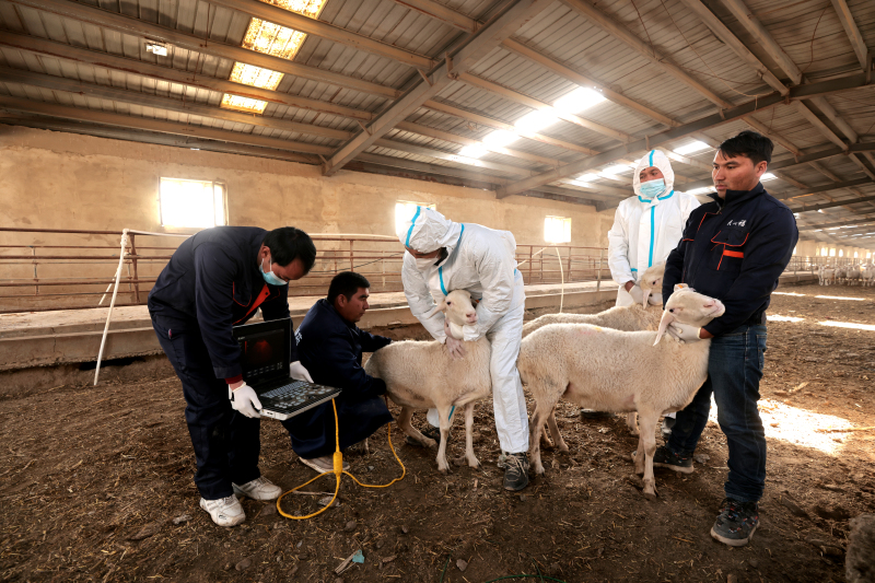 在莎车县巴格阿瓦提乡良繁中心,棚内一只只绒毛厚实的小羊羔活蹦乱跳,清脆的“咩咩”声此起彼伏。畜牧技术人员正逐只为三个月龄羔羊检查身体、测量生长数据,详细记录健康状况。