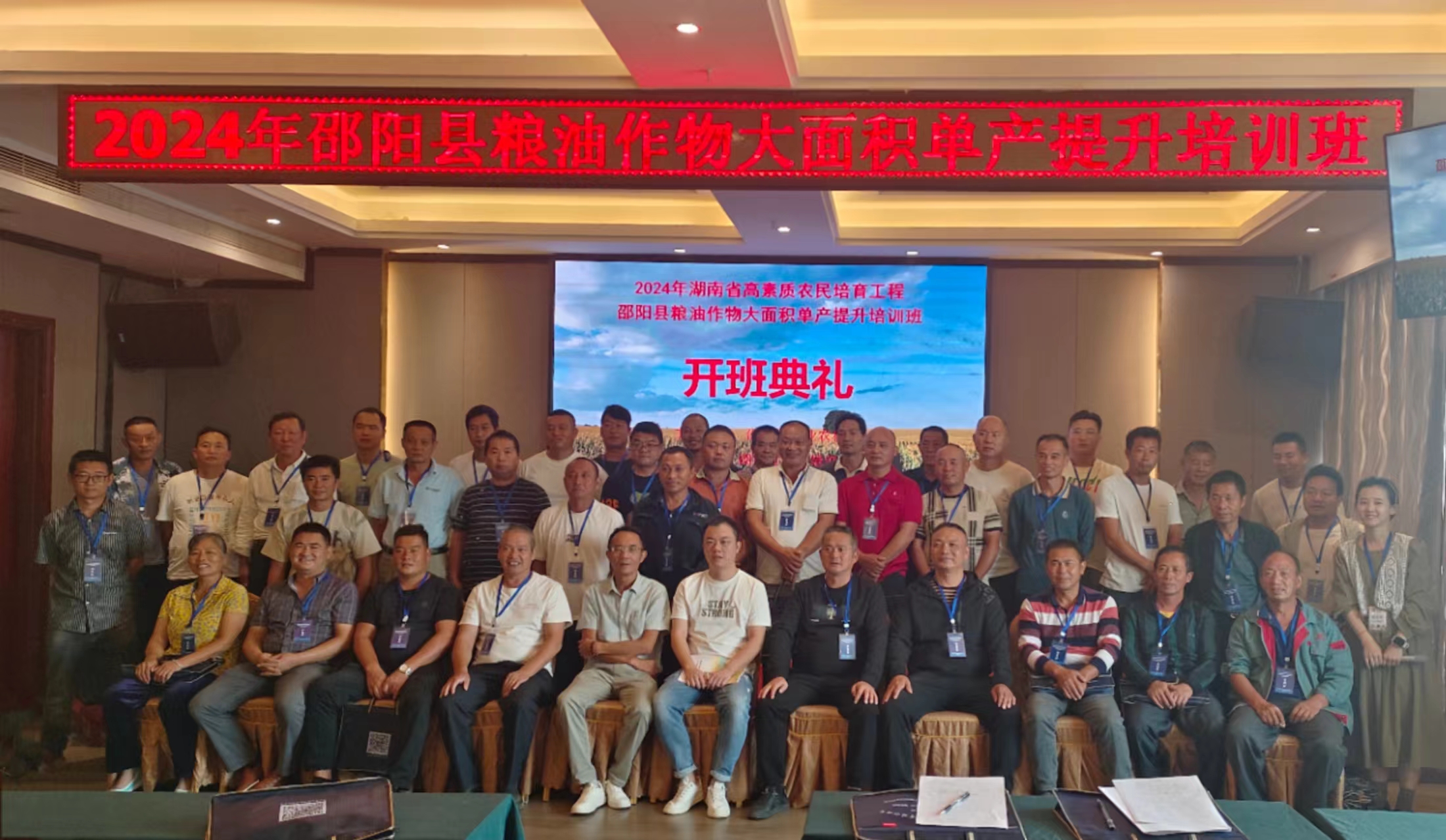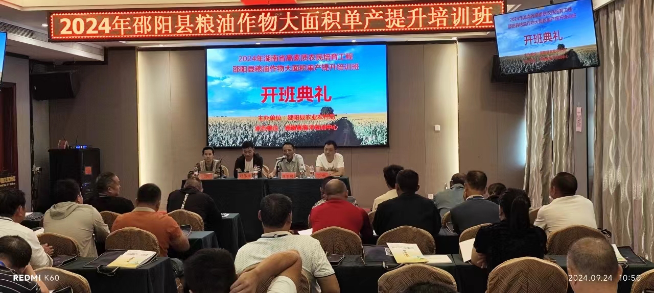 2024年9月24日,邵阳县高素质农民培育粮油作物大面积单产提升培训班在邵阳县凯曼酒店举办。本次培训由邵阳县农业农村局主办,湖南省隆平培训中心承办,为期6天,50名来自邵阳县各乡镇的农民学员参加了此次培训。