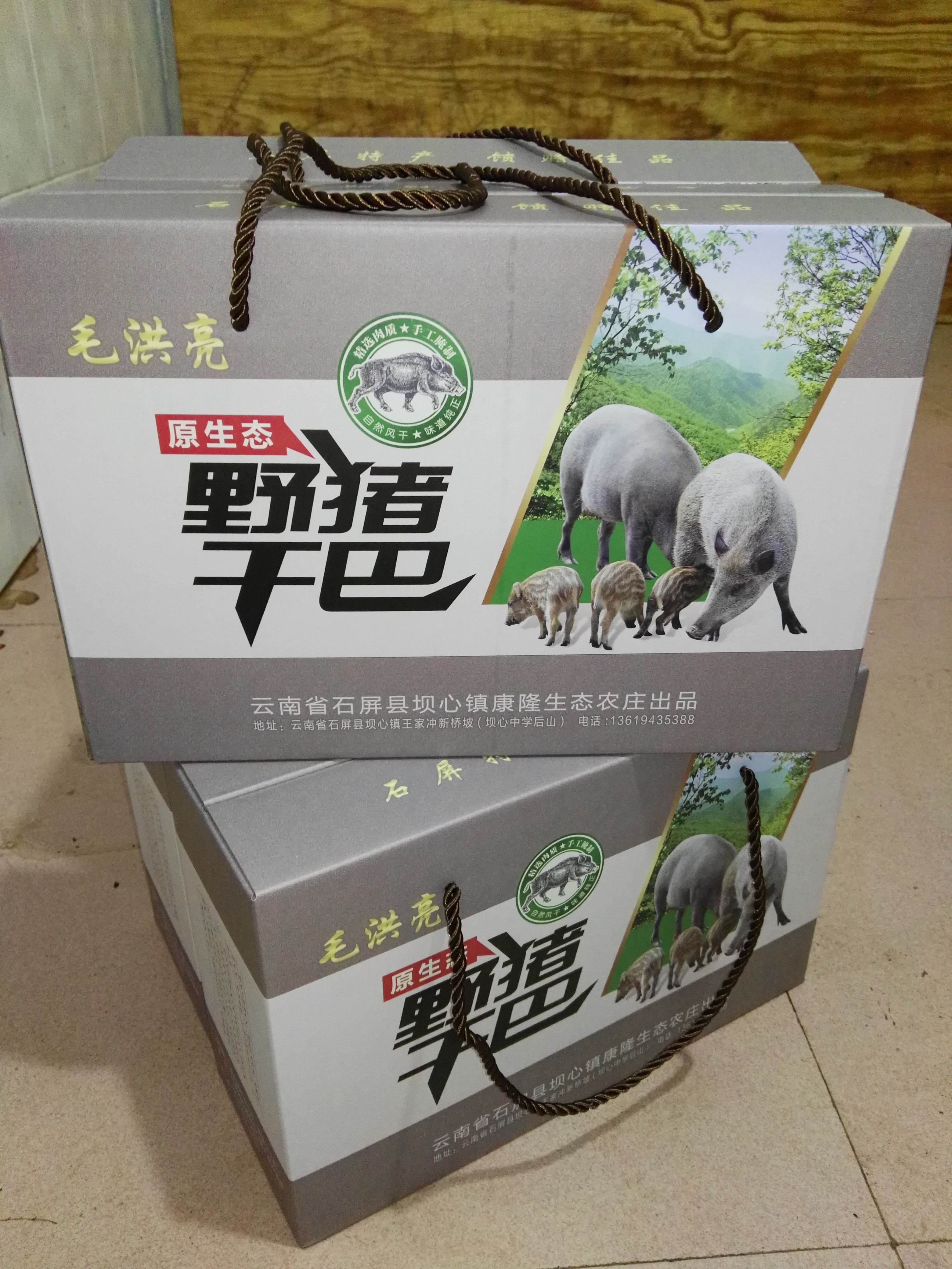 我农庄长期供应自产的毛洪亮牌原生态野猪干巴,3斤装180元一盒,免邮费,质量保证